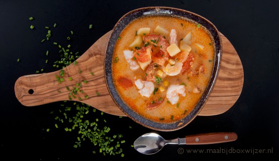 Het tweede test-gerecht is een garnalensoep met kokos, mais, aardappel en tomaat. Vooraf twijfelen we of deze combinatie ons lekker lijkt, dus we zijn erg benieuwd. Bij dit gerecht hebben we iets meer snijwerk van de maiskolven, aardappels en tomaten, dus het gerecht staat deze keer in 35 minuten op tafel. We hebben voor dit gerecht amper producten uit onze eigen keukenkast nodig (enkel zout, peper, bouillonblokje en olijfolie). Wat een verrassende, romige soep. De soep valt direct goed in de smaak! De hoeveelheid bij dit gerecht is juist erg ruim. Sterker nog, we houden zelfs ruime porties over die we bewaren voor de volgende dag.