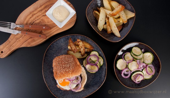 Een rijkbelegde burger, 100% vegetarisch. Dat lijkt ons wel wat! In de oven bereiden we bij dit gerecht de aardappels, courgette en rode ui. De portobello's beleggen we met kaas en bakken we ook nog even mee in de oven. De grote hamburgerbroodjes beleggen we vervolgens met de portobello met gesmolten kaas en een spiegelei. Daarbij serveren we de geroosterde groenten. De bijgeleverde rozemarijn en tijm bij dit gerecht matchen perfect. Dit gerecht kostte ons wel wat meer tijd (totaal 45 minuten), mede door de oventijd. Maar het resultaat was erg lekker! Leuk om eens deze vegetarische variant te maken die we zelf niet snel hadden bedacht. Dat maakt het koken met een maaltijdbox zo leuk!De recepten bij HelloFresh